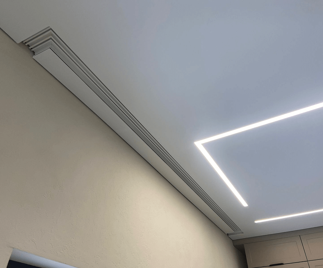 Необычные натяжные потолки со световыми линиями, переходящими на стену! Красиво, оригинально и современно. Рассказываем, показываем, объясняем.