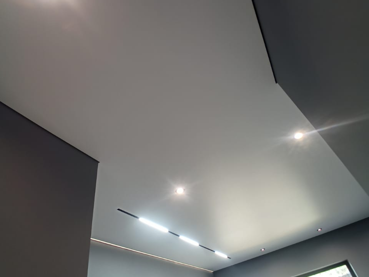 Теневой потолок с подсветкой — конструкция с 6-миллиметровым зазором по периметру между полотном и стенами. Ключевая его особенность в использовании специального профиля EuroKRAAB черного или белого цвета, изготовленного из алюминия. Такой оттенок выбран не случайно. Он позволяет скрыть те части профиля, которые видны через щель.